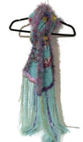 I knitted the scarf using several fibers, one is a light green alpaca yarn, and the other one is a novelty yarn (made from spinning different fibers). I crocheted the sides of the scarf with a polyester eyelash yarn (green, blue, pink), making tassel/fringes with the alpaca and novelty yarn.